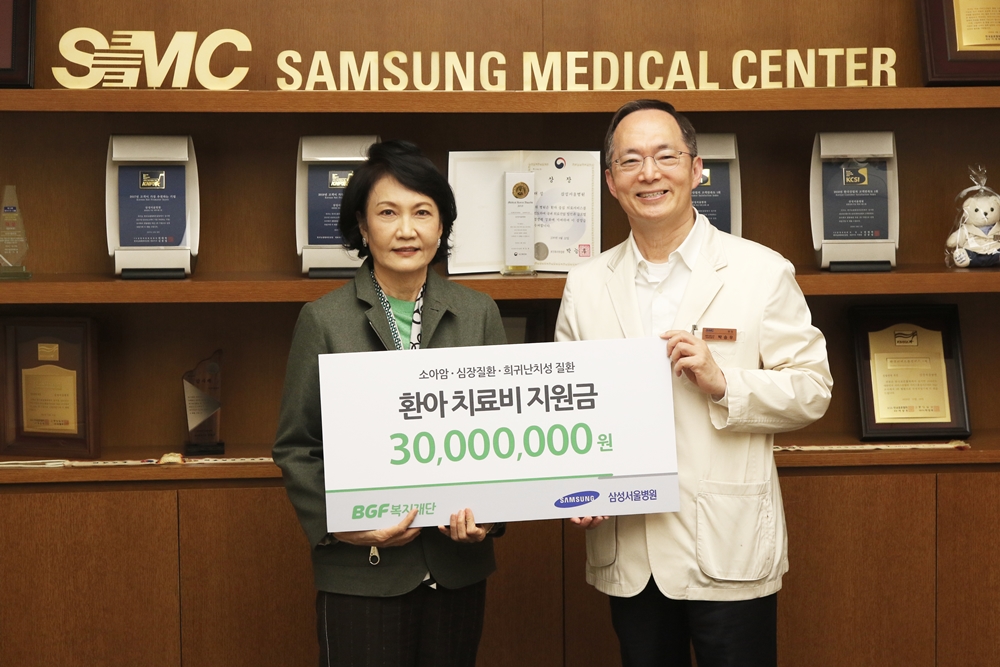 [사진= BGF복지재단은 지난 19일 삼성서울병원에 소아암, 심장질환, 희귀난치성 질환 대상 환아 치료비 지원금을 전달했다. BGF복지재단 양경희 이사장(좌)과 삼성서울병원 박승우 원장(우)이 치료비 전달식 후 기념 촬영을 하고 있다.]