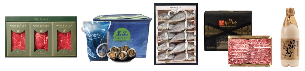 <(좌측부터) 우텐더 1++ 한우 세트, 완도 활전복 세트, 영광 굴비 세트, 횡성 한우 세트, 해창 막걸리>