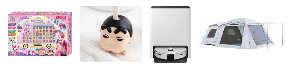 <(좌측부터) 티니핑 에듀버스, 짱구 칫솔 살균기, 스팀 로봇 청소기, 터프 스크린 2룸 하우스(캠핑용 텐트)>