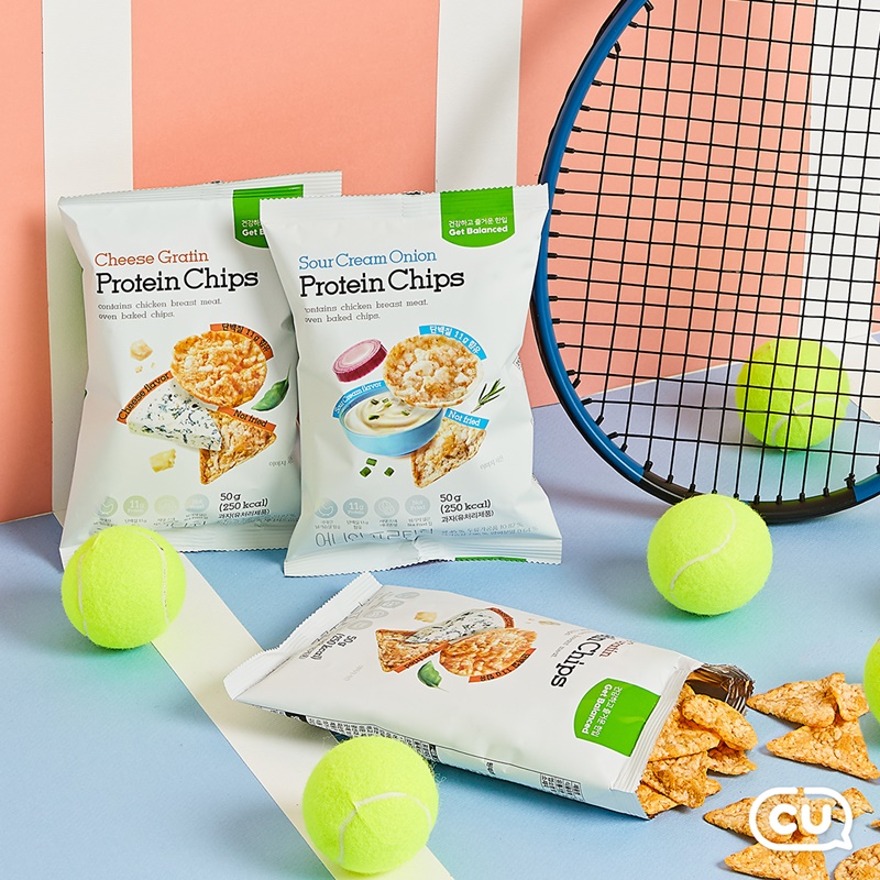 CU는 Get balanced 첫 상품으로 이달 8일부터 단백질 함량은 늘리고 당류는 줄인 ‘프로틴 칩 2종(양파맛, 치즈맛 / 각 2,000원)’을 선보인다.