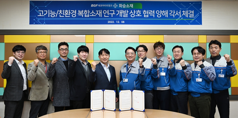 BGF그룹의 소재 부문 계열사인 BGF에코머티리얼즈가 정밀화학 전문 기업 화승소재와 미래 복합소재 및 친환경 소재 공동연구개발 업무 협약을 체결했다.