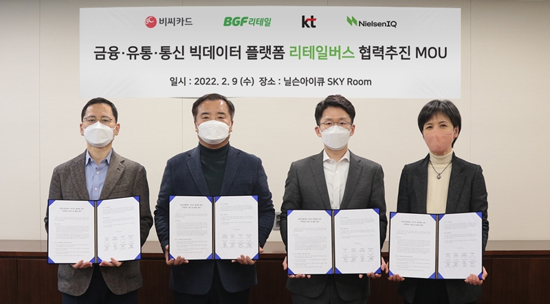 이날 업무협약식은 BGF리테일 송지택 혁신부문장과 BC카드 변형균 AI빅데이터본부장, KT 최준기 AI/BigData 사업본부장, 닐슨아이큐코리아 박춘남 Retailer Vertical 본부장 등 관계자들이 참석한 가운데 서울시 중구에 위치한 닐슨아이큐코리아 본사에서 진행됐다.