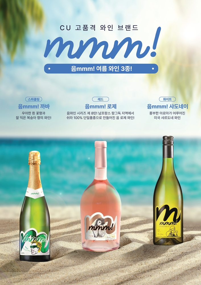 CU는 여름 와인 시장 활성화를 목표로 지난 달 시그니처 와인 브랜드 mmm(음)!에서 여름과 어울리는 로제 와인을 출시했다. 남프랑스 랑그독 지역의 쉬라 단일 품종으로 만든 시원하게 칠링해 마시면 진한 풍미를 느낄 수 있는 핑크빛 와인이다.