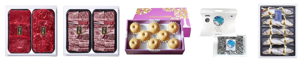 <(좌측부터) 농협 한우 가성비, 농협 한우 갈비, 아침농원 배, 남해 실속 건어물, 명품 참굴비>