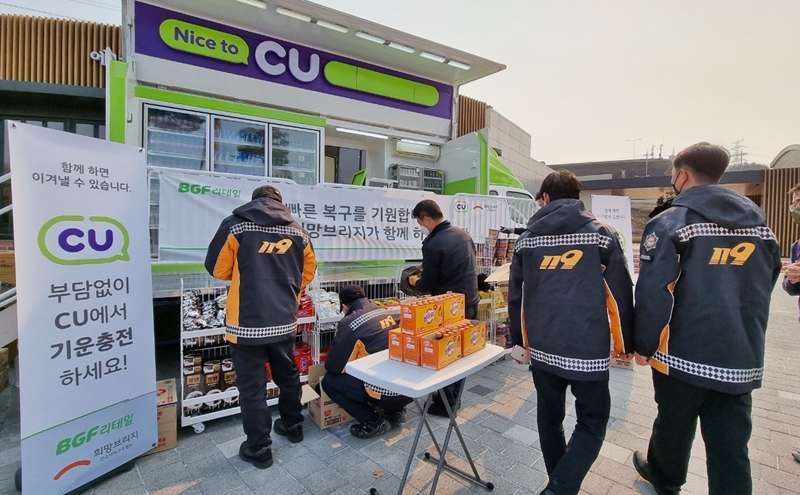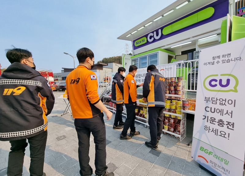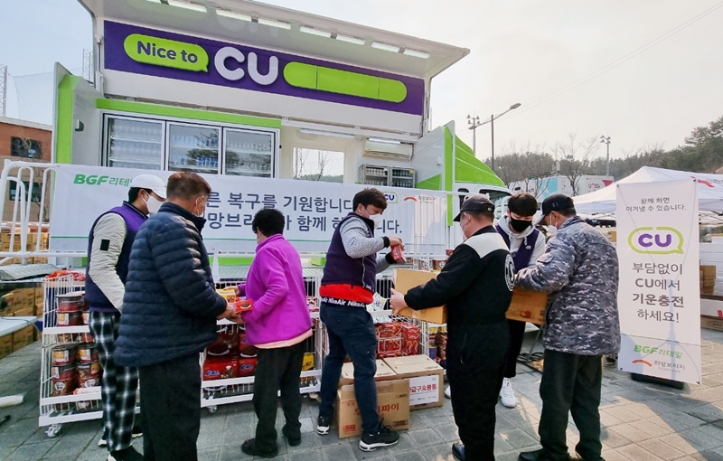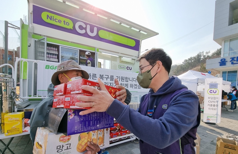 BGF리테일은 업계에서 유일하게 운영 중인 CU 이동형 편의점을 이재민 등이 모여 있는 울진국민체육센터와 소방본부가 위치한 한울원자력본부로 보내 빵류, 라면, 생수, 이온음료 등 식음료를 비롯해 보온에 필요한 핫팩까지 총 2만여 개 제품을 지원했다.
