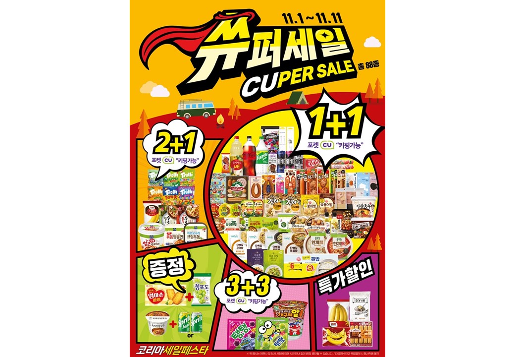 CU의 쓔퍼세일은 주요 카테고리에서 고객들의 수요가 높은 인기 상품들만 따로 모아 매달 1일부터 11일까지 진행되는 특별 행사로, 11월에는 90여 개의 상품들을 대상으로 1+1, 2+1, 3+3 등 다양한 증정 및 할인 혜택을 제공한다.