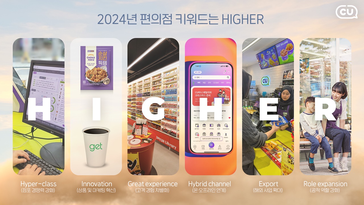 2024 편의점 트렌드를 담은 HIGHER는 ▲Hyper-class(점포 경쟁력 강화) ▲Innovation (상품 및 마케팅 혁신) ▲Great experience(고객 경험 차별화) ▲Hybrid channel (온·오프라인 연계) ▲Export(해외 사업 확대) ▲Role expansion(공적 역할 강화)를 의미한다.