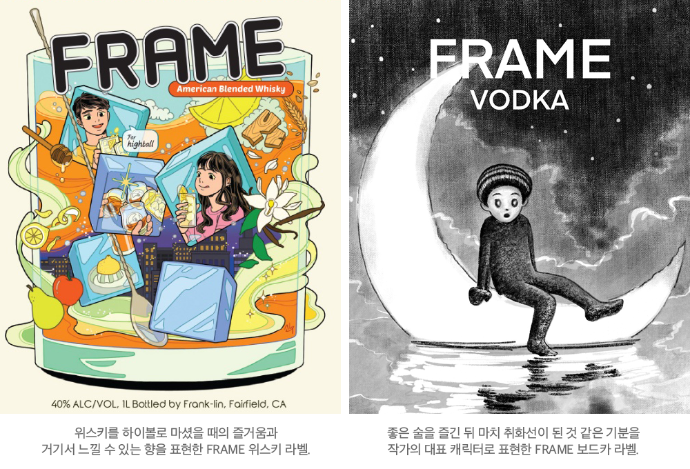 10여 명의 작가들을 추천받아 고민한 끝에 안우주 작가님, 최희정 작가님과의 협업을 결정했습니다. 덕분에 힙한 감성의 색다른 위스키를 만날 수 있게 되었어요. FRAME은 ‘액자’, ‘틀’이라는 뜻을 가지고 있죠. 위스키 병을 하나의 액자로, 그 위의 라벨을 작가님들의 작품으로 설정한 것인데요. 심혈을 기울인 라벨인 만큼 FRAME을 모두 즐긴 후에도 꽃병이나 장식품 등으로 활용할 수 있기를 바랍니다.