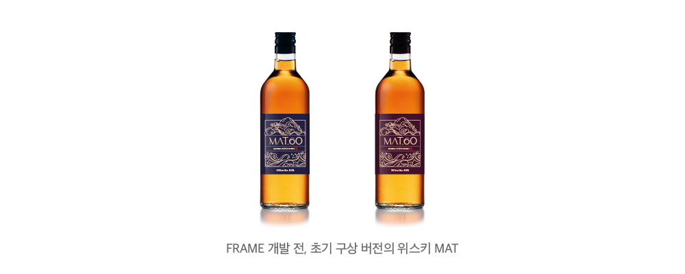 처음에는 ‘MAT’이라는 초기 버전의 위스키를 구상했습니다. 맛(Mat), 말 그대로 ‘맛있다’는 표현을 담은 네이밍이었는데요. 거의 실현할 단계까지 진행됐었죠. 원액 퀄리티를 보장할 수 있을 뿐 아니라 50도 이상의 도수를 실현할 수 있는 방법을 찾았던 겁니다. 그런데 문제가 있었습니다. 제조 과정상 스코틀랜드에서 원액을 생산해 벨기에에서 최종적으로 위스키를 병입해야 했는데요. 그러다 보니 ‘스카치 위스키’라고 표기할 수 없고 ‘벨기에 위스키’로 표기해야 했던 것입니다. 긴 고민 끝에 결국 Mat은 좋은 경험으로만 남기기로, 쓰디쓴 결정을 내렸죠. 아까웠지만 FRAME을 탄생시키고 보니 최선의 결정이었다고 생각합니다.