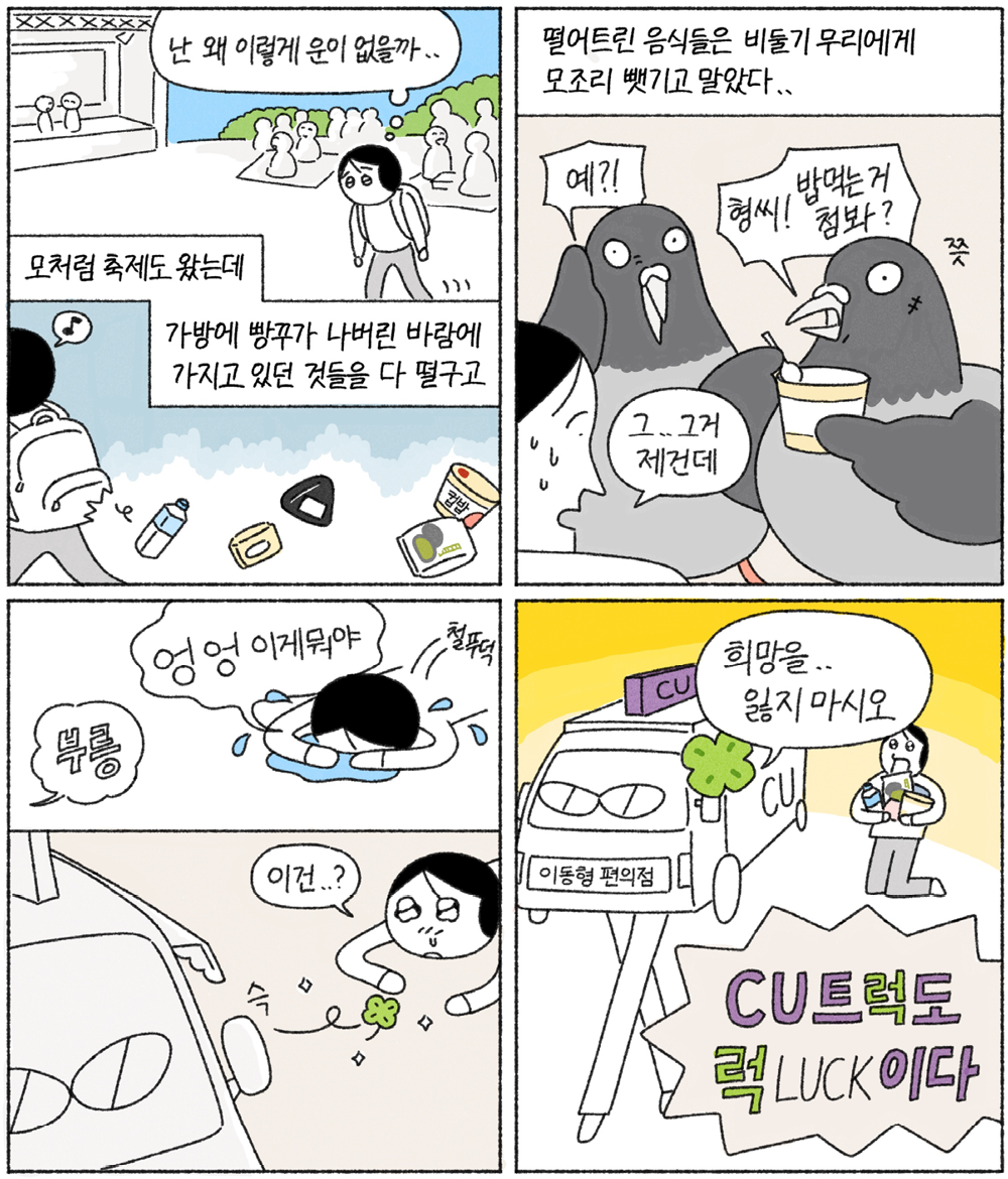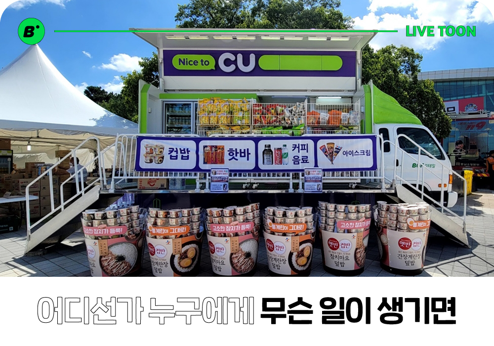 한참 흥이 오르는 축제장에서, 긴박한 구호 현장에서 언제나 혜성처럼 등장하는 편의점이 있습니다. CU에서 유일하게 운영하는 ‘이동형 편의점’이죠. 생수 한 모금 아쉬울 때, 라면 하나가 긴급할 때! 필요한 곳에 필요한 물건을 바로바로 전하는 바퀴 달린 CU를 소개합니다.