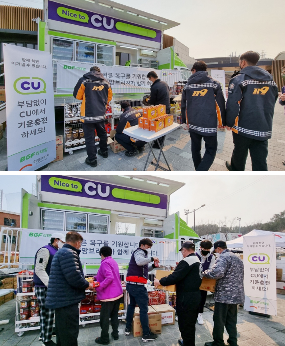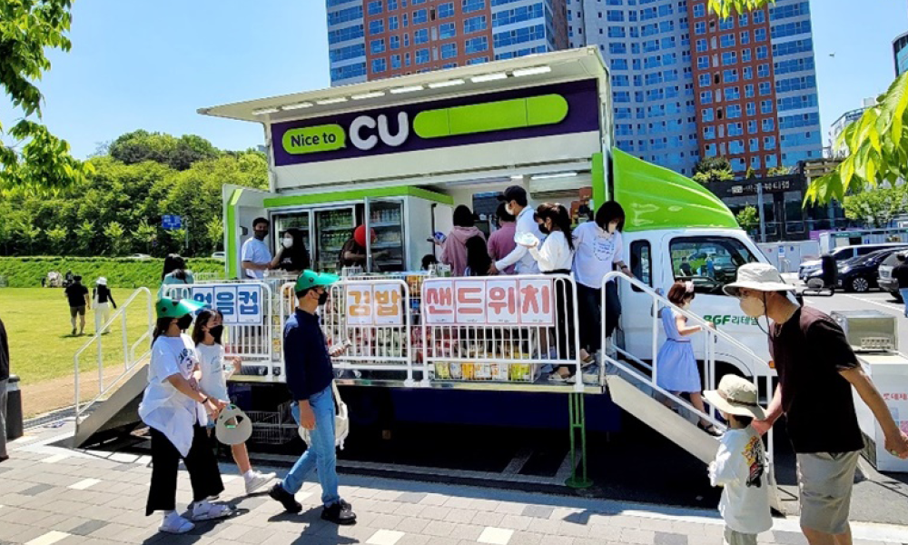 아니에요. 아까 말씀드렸죠? ‘고객들이 CU를 필요로 한다면 어디든 달려간다’고요. (웃음) 재난현장이나 구호현장에도 이동형 편의점이 출동한답니다. 경북 울진에서 산불 피해가 났을 때에도, 전남 구례에 침수 피해 현장에도 CU가 달려갔지요. 이재민들과 소방 인력, 자원봉사자에게 생수와 라면 등 식음료를 무상 공급하면서 구호에 도움을 드렸던 기억이 있네요. BGF의 사회공헌활동에 앞으로도 CU 이동형 편의점을 적극 투입할 예정이고요.