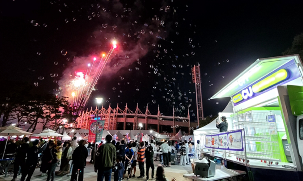 맞아요. 지역축제에서 쉽게 CU 이동형 편의점을 만나볼 수 있어요. 특히 코로나19 이후 중단됐던 지역축제가 2022년 즈음 다시 활성화되면서 이동형 편의점도 활기를 띠기 시작했죠. 작년 여름에는 K-POP 음악방송 촬영장인 NPOP(엔팝) 첫 방송 현장에, 가을에는 경기도 가평 자라섬에서 열린 국내 최대 뮤직 캠핑 페스티벌 ‘그린캠프 2023’에도 함께했습니다. 가장 최근에는 목동운동장에서 열린 ‘하나은행 2024 K리그2’ 2라운드 수원삼성과의 홈경기에 등장했답니다.