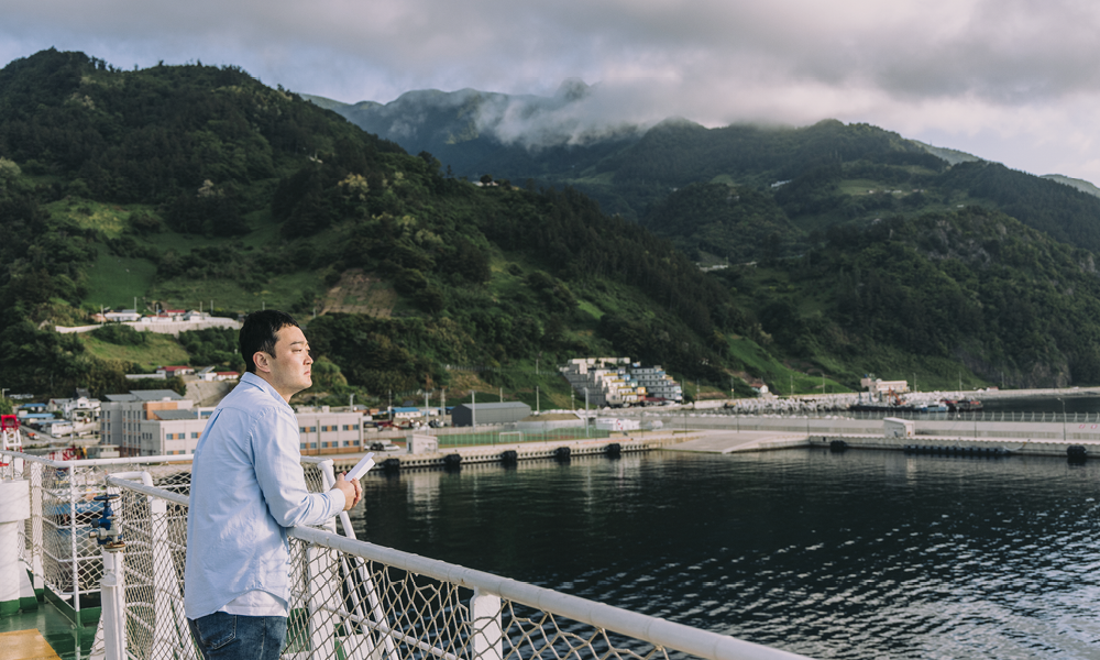 다음날 오전 5시 30분. 아직 배는 바다 위를 가로지르는 중이건만 갑판은 동해의 일출을 보려는 사람들로 벌써 붐빕니다. 갈매기 한 마리가 겁도 없이 날아들더니 날개를 휘익 두르고선 뱃머리에 여유로이 자리를 잡고요. 몇 분을 더 들어갔을까, 비로소 위풍당당하게 머리를 내민 짙푸른 바위들이 눈에 들어오기 시작합니다. 시리도록 맑아 멀리서도 바닥이 들여다보이는 울릉도의 바다도 그 모습을 드러내는데요. 일출도, 유람선도 익숙한 임 책임이지만 울릉도의 풍경만큼은 여전히 그의 가슴을 울립니다.