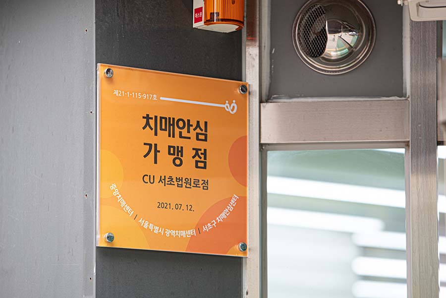 CU서초법원로점 입구에는 ‘치매안심가맹점’이라는 주황색 알림판이 부착되어 있습니다. 이는 치매환자와 더불어 살아갈 수 있는 사회적 공감대 형성과 치매 친화적 환경 조성의 일환으로 치매파트너 교육을 받고 지역사회 치매안전망 구축에 적극 동참하는 개인사업장을 대상으로 지정됩니다. 지역민에게 가장 친숙한 공간으로 자리잡은 공간에서 이웃에 대한 꾸준한 관심을, 적극적인 나눔으로 표현한 박준형 점주님의 따뜻한 하루에 동행해보았습니다.