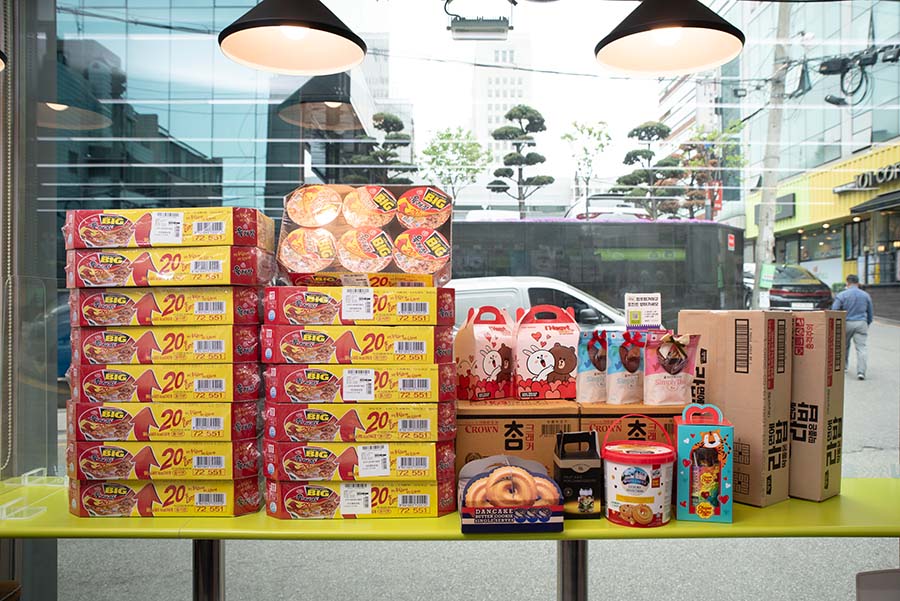 점주님의 정성만큼 각종 물건들이 그득그득 쌓여갑니다. 산처럼 쌓인 제품들을 정리하면서도 전달할 물건이 너무 적은 것 같다며 겸연쩍어하는 점주님의 모습에 소소한 행복이 느껴집니다.