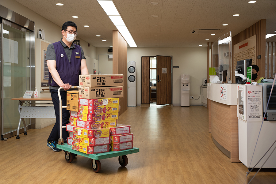 어르신들에게 드릴 물건을 한 아름 싣고 서초구치매안심센터에 도착했습니다. 센터는 치매조기검진, 치매인식개선, 인지건강프로그램, 저소득층 치매환자 지원사업 등을 수행하고 있습니다. 소소한 물건이지만, 지역의 어르신들에게 작은 도움이라도 드릴 수 있다는 생각에 점주님은 뿌듯한 마음이 앞섭니다.