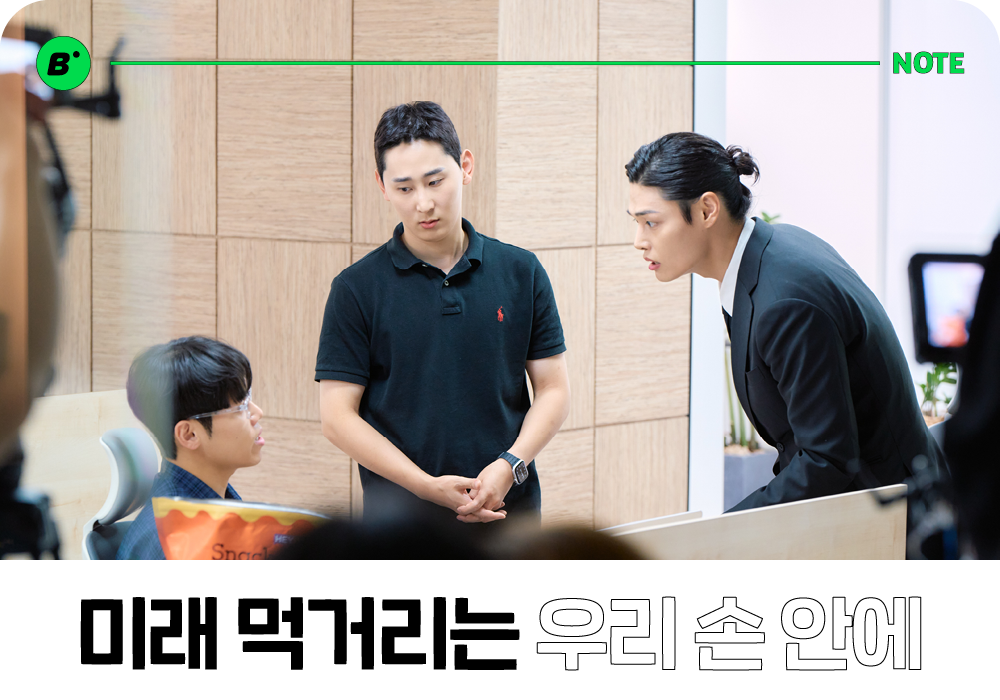 <미래전략 먹거리실>의 캐스팅 배경이나 촬영 현장에 대해 궁금해하는 분들도 계세요. 아마도 모델 정혁, 개그맨 남현승, 배우 남현우와 같은 유명 출연진이 직장인으로 분해 찰떡 같은 연기력을 소화하고 있기 때문이 아닐까 싶은데요. (웃음) 맥락 없는 남 과장의 샤우팅에는 저도 속절없이 웃음이 터지더라고요. 본부장의 노잼 발언에 어색한 미소를 짓는 최 사원이나, 자신의 아이디어를 가로채는 듯한 상사에 분개하는 남 대리의 모습은 직장인 누구나 공감할 수 있을 거예요.