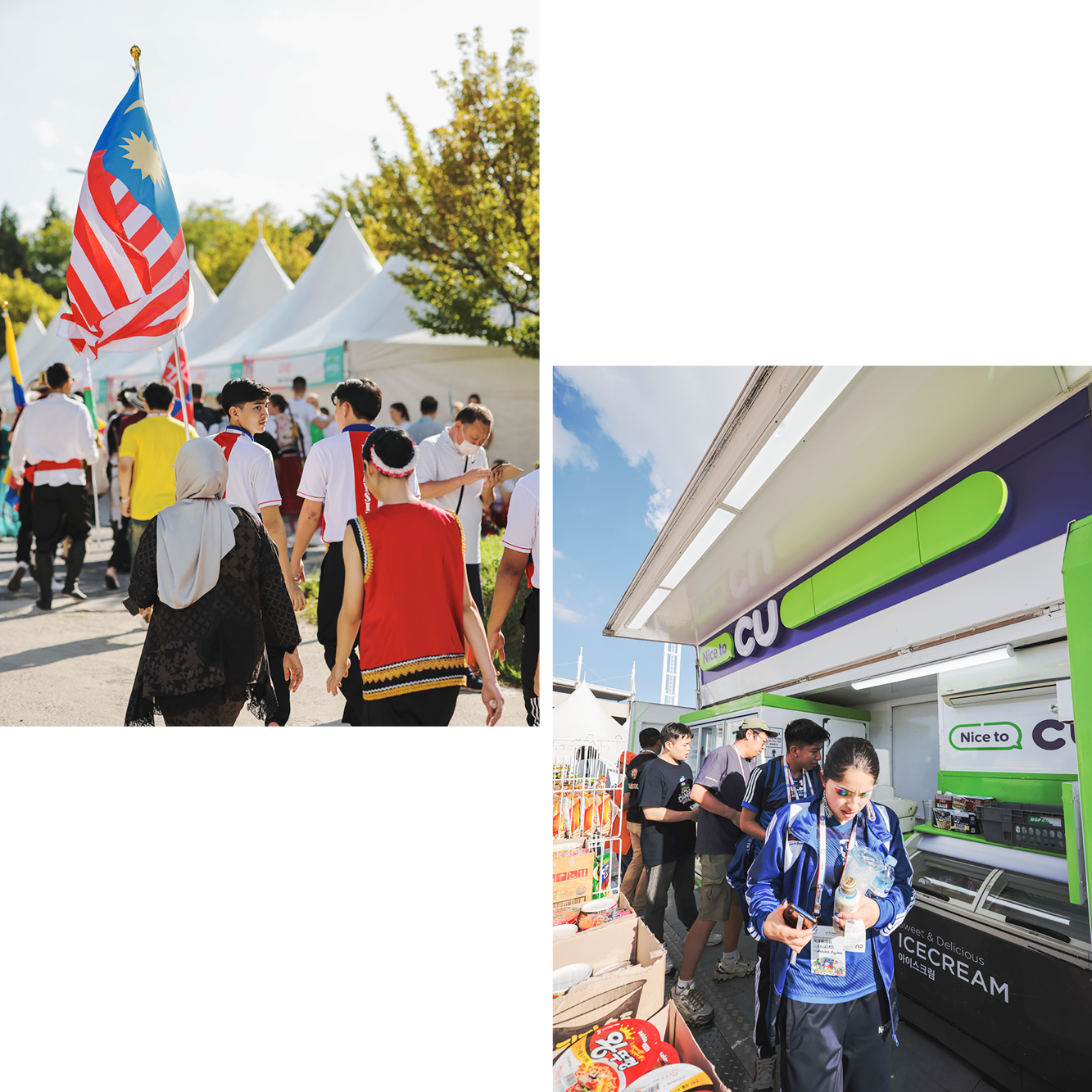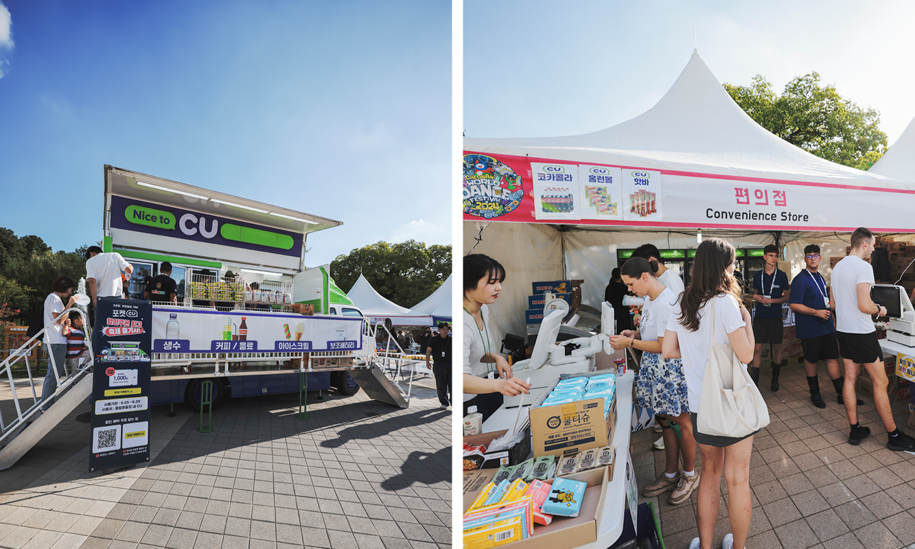 글로벌한 축제에 K-푸드가 빠질 수 없죠. CU는 코로나19가 자취를 감추기 시작한 2022년부터 천안흥타령춤축제에 이동형편의점을 선보이며 국내외 방문객의 이목을 사로잡았습니다. 시원한 생수는 기본, 커피와 아이스크림, 보조배터리 등 생필품까지 구비해 만반의 준비를 갖췄고요.
