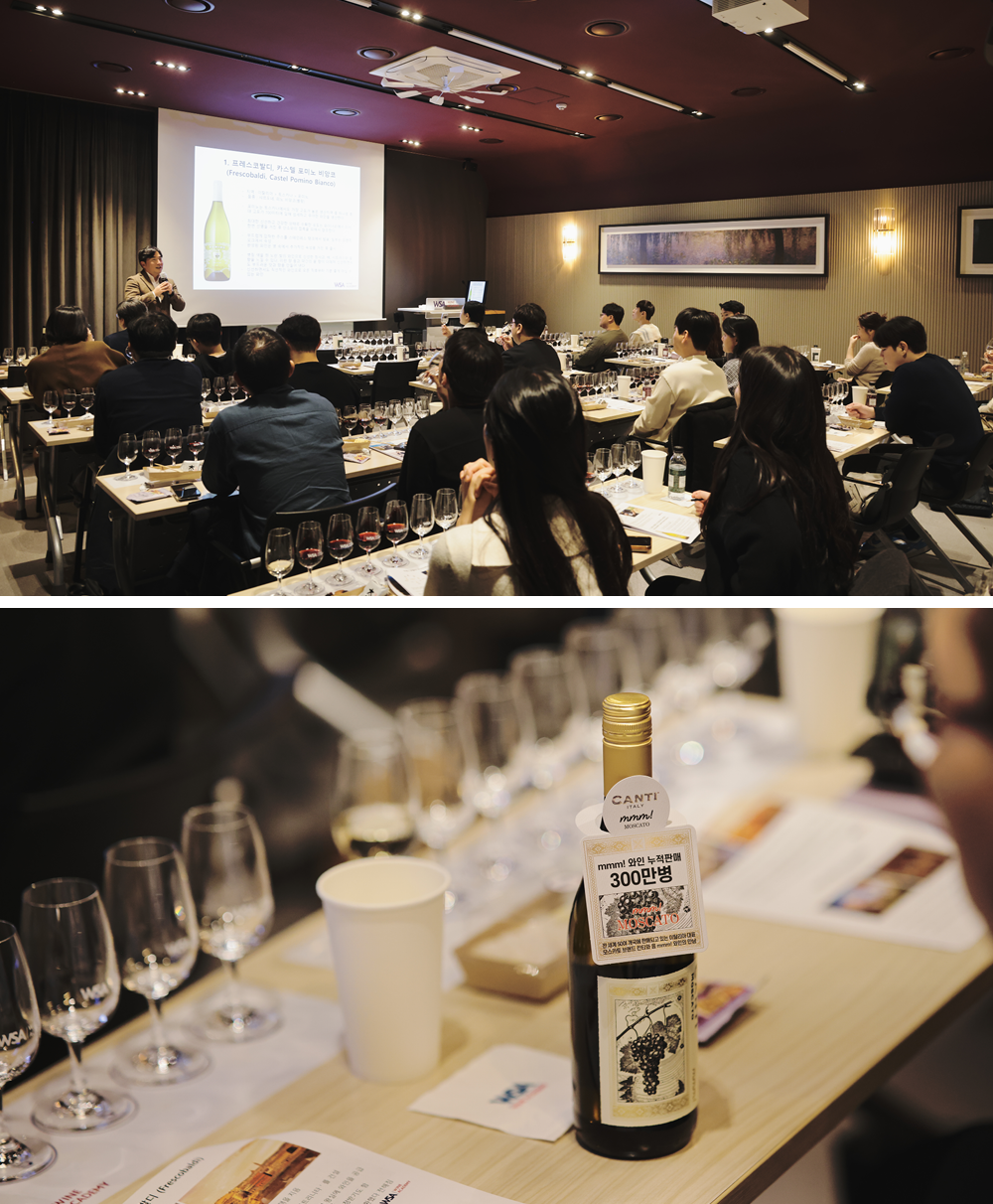 오늘 이곳에서는 정기교육 이외에 특별한 자리가 마련되었습니다. 바로 CU가 WSA와인아카데미와 함께 주최한, ‘프레스코 발디&칸티 와인 시음회’죠. CU에서 웬 와인 시음회냐고 물으신다면 섭섭합니다. CU BAR의 주류 리스트 중에서도 와인 섹션은 전문가를 비롯한 와인 덕후들에게 정말 높은 평가를 받고 있거든요. 특히 CU의 PB 주류인 ‘음mmm!’ 와인 시리즈는 저렴한 가격 대비 높은 품질로 입소문을 탔습니다. 적당한 산도와 밸런스가 대중의 취향을 저격했다는 평을 한몸에 받고 있죠. 그리고 연말을 맞아, CU의 음mmm! 와인 리스트에 뉴페이스가 등장했습니다. 바로 음mmm! 모스카토 와인입니다.