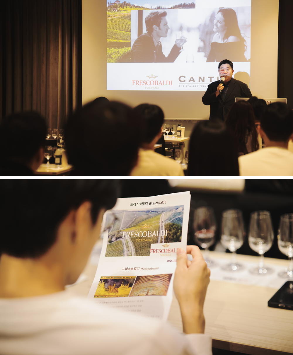 강의에 푹 빠져든 참관객들 앞에는 순차적으로 프레스코발디의 레드와인이 하나씩 서브되었습니다. 특히 세 번째로 시음한 카스틸리오니는 참관객들의 찬탄을 자아냈는데요. 마치 토스카나의 밝은 햇볕처럼 반짝이는 루비 컬러가 남다른 이 와인은 오크통에서 숙성됐다고 합니다. 입안을 벨벳처럼 둥글고 부드럽게 감싸는 질감에 참관객들은 너나 할 것 없이 호기심을 내비쳤습니다. 아는 만큼 보이는 법이라고 했던가요? 생산지와 역사, 그리고 숙성 과정과 테이스팅 노트까지 전문가의 설명을 들으며 참관객들은 저마다 자신의 ‘취저’를 찾는 데 여념이 없었답니다.