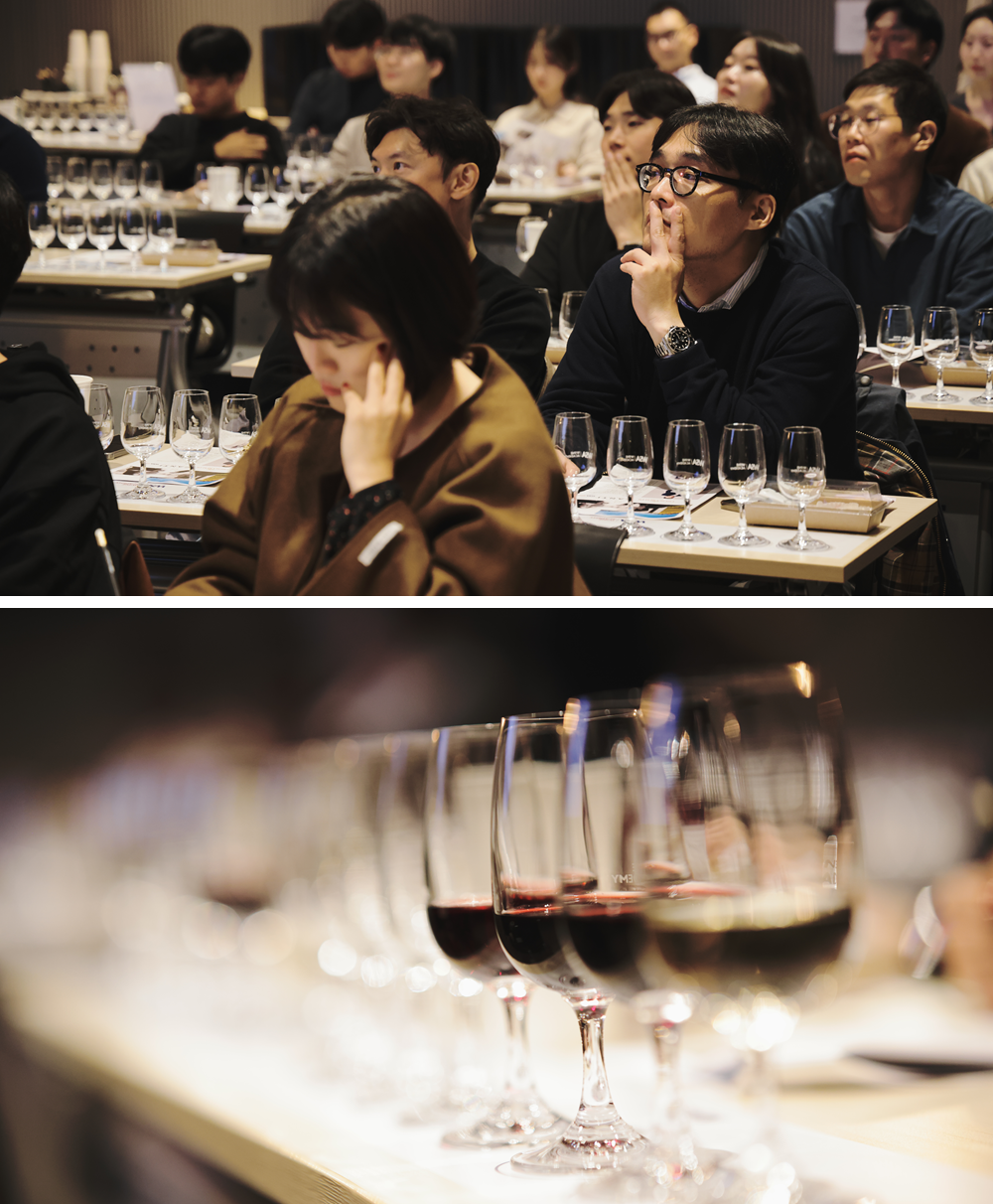 2009년 와인스페셜리스트 대회 1위, 2012년 국가대표 소믈리에 대회 1위, 2016년 세계 소믈리에 대회 한국 대표로 출전한 길고도 화려한 경력의 대표 소믈리에 오형우 강사는 “제가 평소 강의를 많이 다니지만, 거의 모든 분들이 시음을 하기 전엔 답변을 잘 안 하십니다”라며, “그래도 다들 금방 분위기가 풀릴 거예요. 그게 와인의 매력이니까요”라는 말로 포문을 열었습니다. 아니나 다를까 첫 번째 와인, 토스카나의 프레스코발디, 카스텔 포미노 비앙코가 서브되기 시작하자 조용한 감탄사와 함께 박수까지 터져 나옵니다. 급변한 분위기에 다들 웃음을 감추지 못하고요. 오형우 소믈리에 역시 “진작 와인을 서브할 걸 그랬다”며 박자를 맞춥니다.