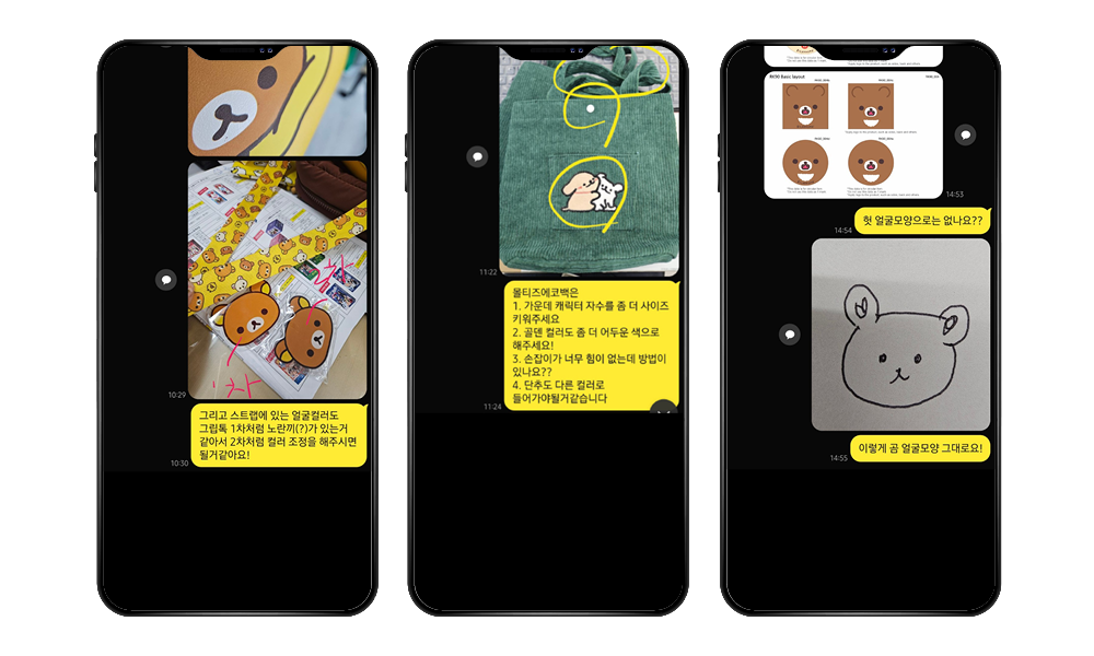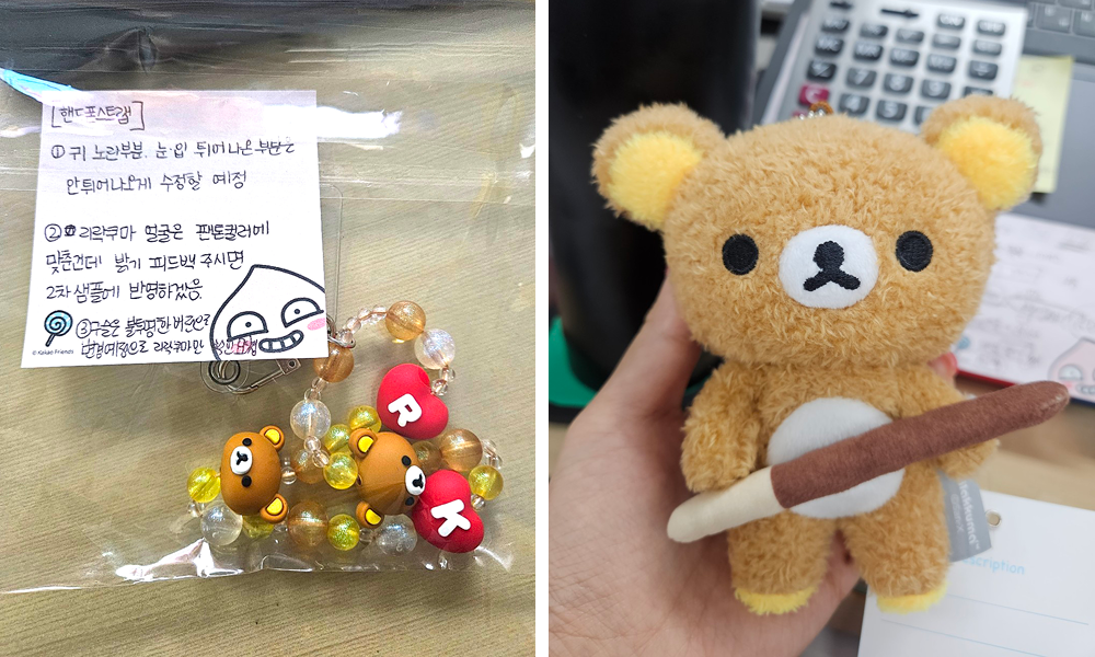 이번 프로젝트에서 최우선으로 고려한 또 한 가지는 품질이었어요. 기존에 출시된 리락쿠마 굿즈의 완성도를 뛰어넘겠다는 야무진 목표를 세웠죠. 상품의 소재와 크기, 색상부터 디자인까지 디테일하게 정하고, 제작업체에 말로 전하기 어려우면 직접 그림을 그려가면서 설명하기도 했어요. 특히 그 과정에서 원작사의 엄격한 가이드라인을 거쳐 디자인을 최종 승인받기까지 수십 번 의견 조율이 필요했답니다. 그렇게 무려 40여 종의 상품을 탄생시켰어요. 최종 출시에 이르기까지 하나하나 제 손을 거친 아이들을 보며, 자식을 낳은 부모의 마음이 이런 걸까 싶더라고요. (웃음) 어찌나 귀엽고 사랑스러운지 동네방네 자랑하고픈 마음을 꾹 참느라 힘들었답니다.