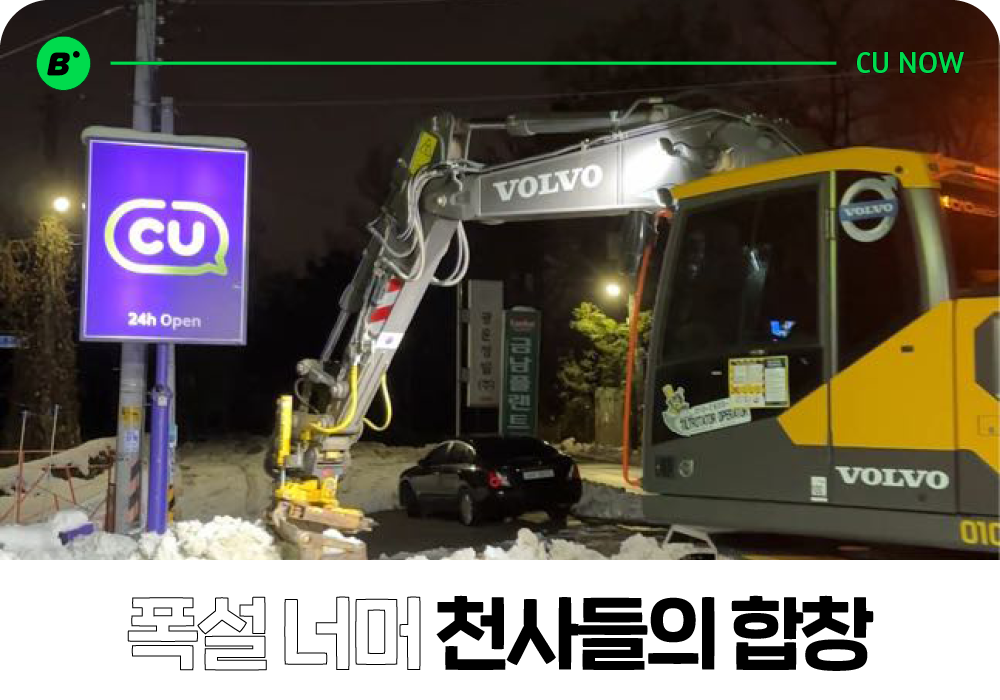 지난 11월 28일 저녁, 겨울 첫눈이 무색해질 정도로 빠르게 쌓인 폭설에 CU화성독정로드점도 눈 속에 서서히 묻혀갔습니다. 저 멀리 포크레인 한 대가 편의점을 방문하자 기적이 찾아옵니다. 작은 선행으로 과분한 답례를 받은 CU화성독정로드점 점주님 따님의 따뜻한 현장으로 여러분을 초대합니다!