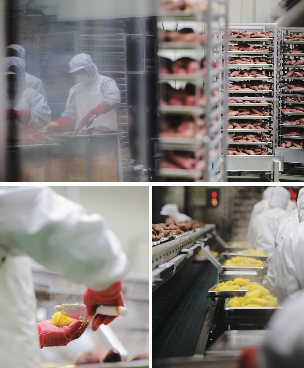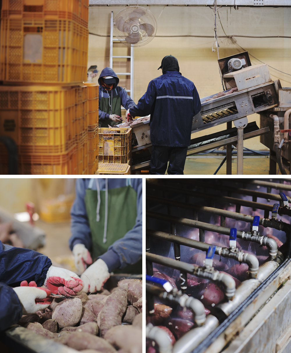 공정을 자세히 들여다볼까요. 밭에서 나온, 아직 흙이 고대로 묻어 있는 꿀고구마를 우선 고창의 지하수로 깨끗이 세척합니다. 이 원물을 열풍 건조한 뒤, 중량과 모양에 따라 일일이 수작업으로 분류하죠. 기계를 이용하면 껍질이 손상되기에 모두 사람의 손으로 분류해야 합니다. 껍질이 손상되면 상품가치도 떨어지지만 무엇보다 맛이 변질되니까요.