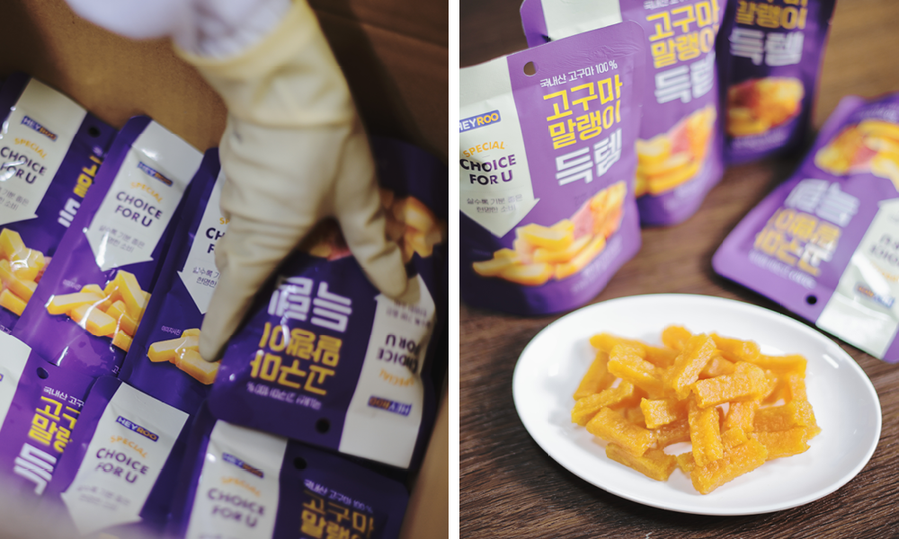 선별 과정에서 누락된, 이른바 ‘불합격’ 고구마는 어떻게 될까요? 크기가 다소 작거나 작업 과정에서 스크래치가 나는 바람에 CU구마로 출하하기는 힘들지만 맛은 그대로인 B급 고구마는 전체 생산량의 30% 정도입니다. 이를 효율적으로 활용하고자 서재필 대표는 가까운 거리에 가공공장을 차려 다양한 고구마 가공식품을 생산하고 있습니다. 앞서 언급한 고구마말랭이 득템 상품도 이 가공공장에서 만들어지죠.