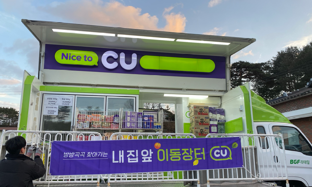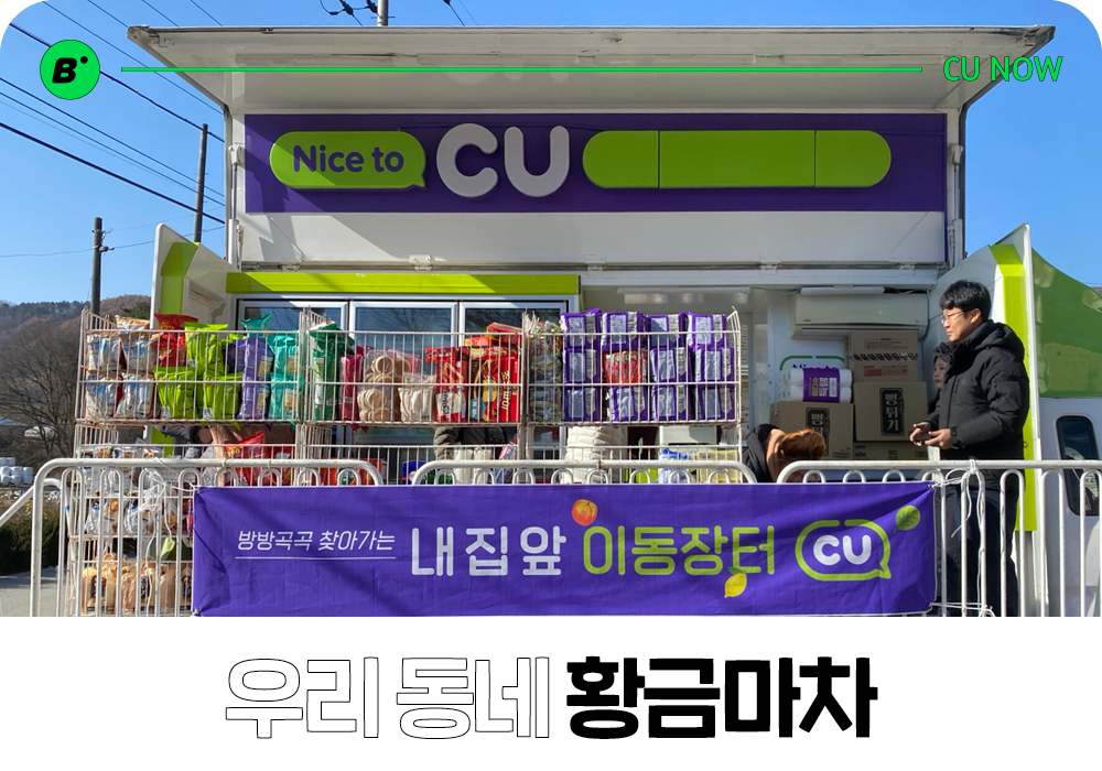 전북 진안군 진안읍에 위치한 평촌마을, 마을회관 앞에 커다란 트럭 하나가 도착했습니다. 동네 어르신들은 손자를 맞듯이 설레는 얼굴로 하나 둘씩 트럭에 오릅니다. “아유, 너무 좋지. 행복하네.” 웃음 짓는 가운데 장바구니에는 라면이며 생수, 정육, 채소가 차곡차곡 담기고요. 식품이 말라버린 사막 같은 이곳에 작은 오아시스를 틔우는 마법! CU가 생필품을 가득 싣고 출발합니다.