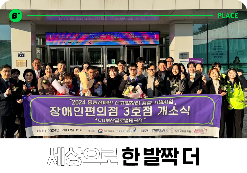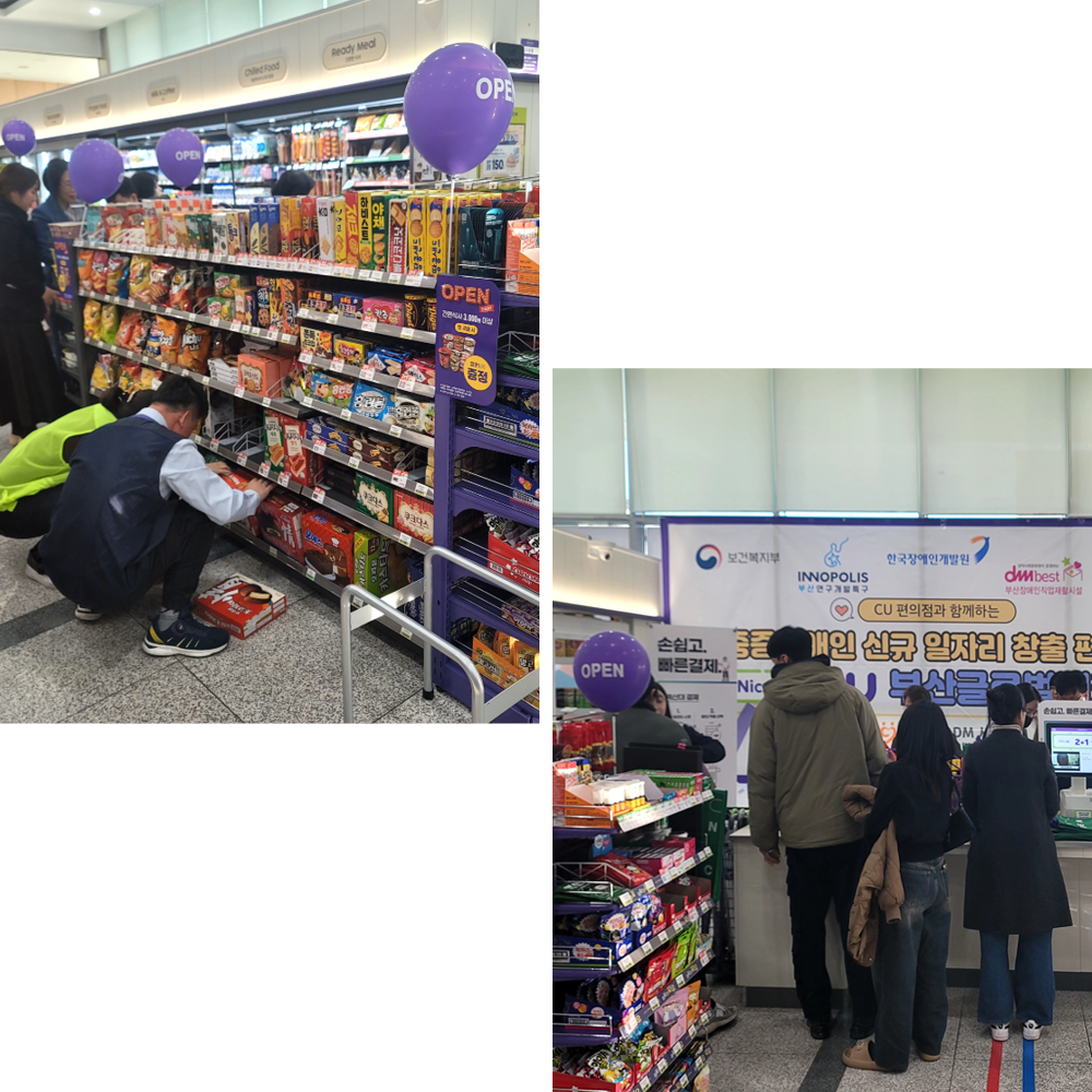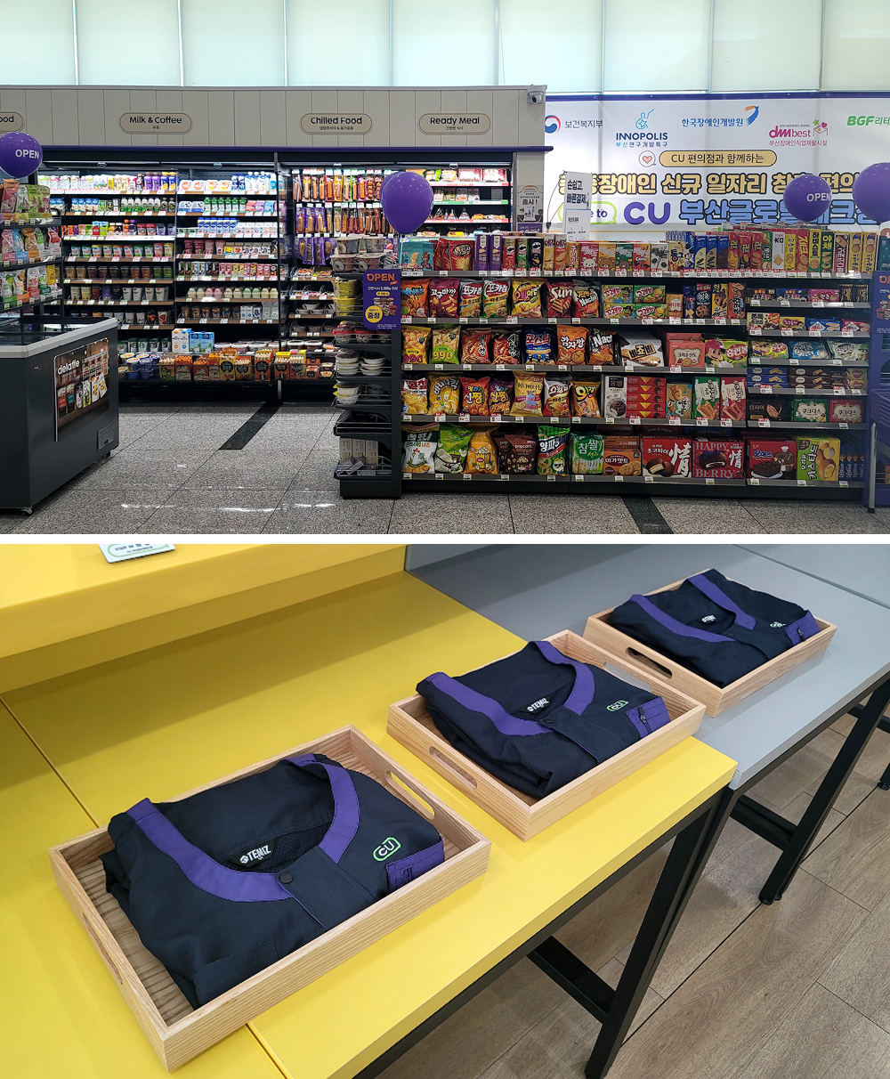 CU부산글로벌테크점은 지난 12월 17일 특별한 개소식도 치렀습니다. 장애인 스태프들은 “발달장애인으로 살아가야 하는 어두운 터널에서 벗어나, 이렇게 매일 출근하는 일터가 있어 행복합니다”, “돈과 물품 등이 눈앞에서 거래되는 상황에 긴장과 책임이 앞서지만, 고객에게 친절히 대하며 물품을 진열하고 계산 업무도 정확하게 해 나가고 있습니다”라며 뿌듯한 소감을 발표했습니다. 직업훈련교사로 이들을 교육해온 매니저, 가족, 그리고 사업 관계자들까지 눈시울이 붉어지는 순간이었죠. 장애인 스태프의 가족은 “우리 딸이 CU에 출퇴근하며 즐거운 미래를 그리게 됐어요”라며 감사를 전했고요.