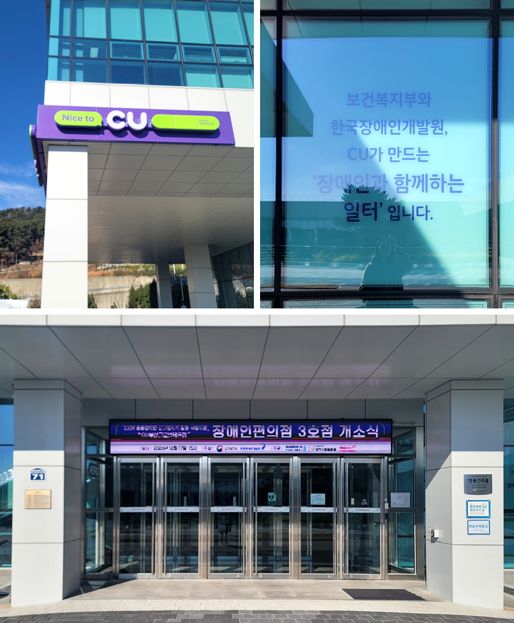 사실 CU부산글로벌테크점은 BGF리테일의 CU제주혼디누림터점, CU국립평창청소년수련원점에 이은 세 번째 장애인 편의점입니다. 우선 장애인 편의점으로서 첫삽을 뜬 CU제주혼디누림터는 제주도 건물 1층에 위치한 편의점인데요. 베리어프리(Barrier-free) 인테리어를 처음 적용하는 등 장애인 스태프의 근무를 위해 많은 담당자들이 고민한 흔적이 보이는 곳입니다. 전국 1호 장애인 편의점으로서 다양한 기관에서 벤치마킹차 탐방 오고 있기도 하죠.