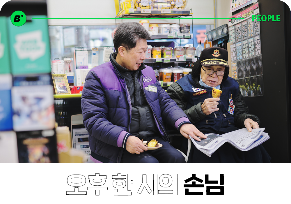 매일 오후 한 시, 어르신의 따님이 출근을 하거나 볼일을 보러 나가며 편의점에 데려다 드리면 어르신은 그때부터 점주님 맞은편에 앉아 졸기도 하고 신문도 보시며 시간을 보내십니다. 겨울에는 또 하나의 루틴이 생기죠. 바로 옆 가게에서 붕어빵을 사와 어르신 하나, 점주님 하나 사이 좋게 나누어 먹는 것입니다. 붕어빵 다음으로는 CU의 꿀고구마도 반으로 잘라 두고 한김 식혀 먹습니다. 점포가 잠시 한갓질 때 고구마를 숟가락으로 얇게 떠 드리면 그렇게 좋아하신다고요. 친아들, 친손자도 하기 어려울 듯한 돌봄 생활을 해온 지 벌써 3년, 그래도 점주님은 힘들다는 생각은 해본 적이 없습니다.