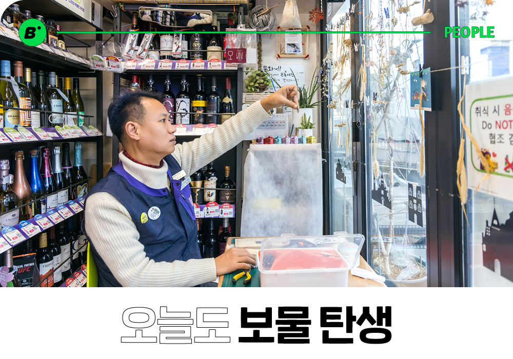 CU신촌노고산점에 들어서면 잠시 어리둥절 주변을 둘러보게 됩니다. 여기가 공예품 전시관인지, 편의점인지 잘 분간이 가지 않거든요. 상품을 고르다가도 벽면을 채운 귀여운 공예품들에 시선이 머물 수밖에 없습니다. 자칭 ‘방구석 공예가’, 아무리 사소한 자연물도 보물로 재탄생시키는 마법의 장인정신을 들여다봅니다.
