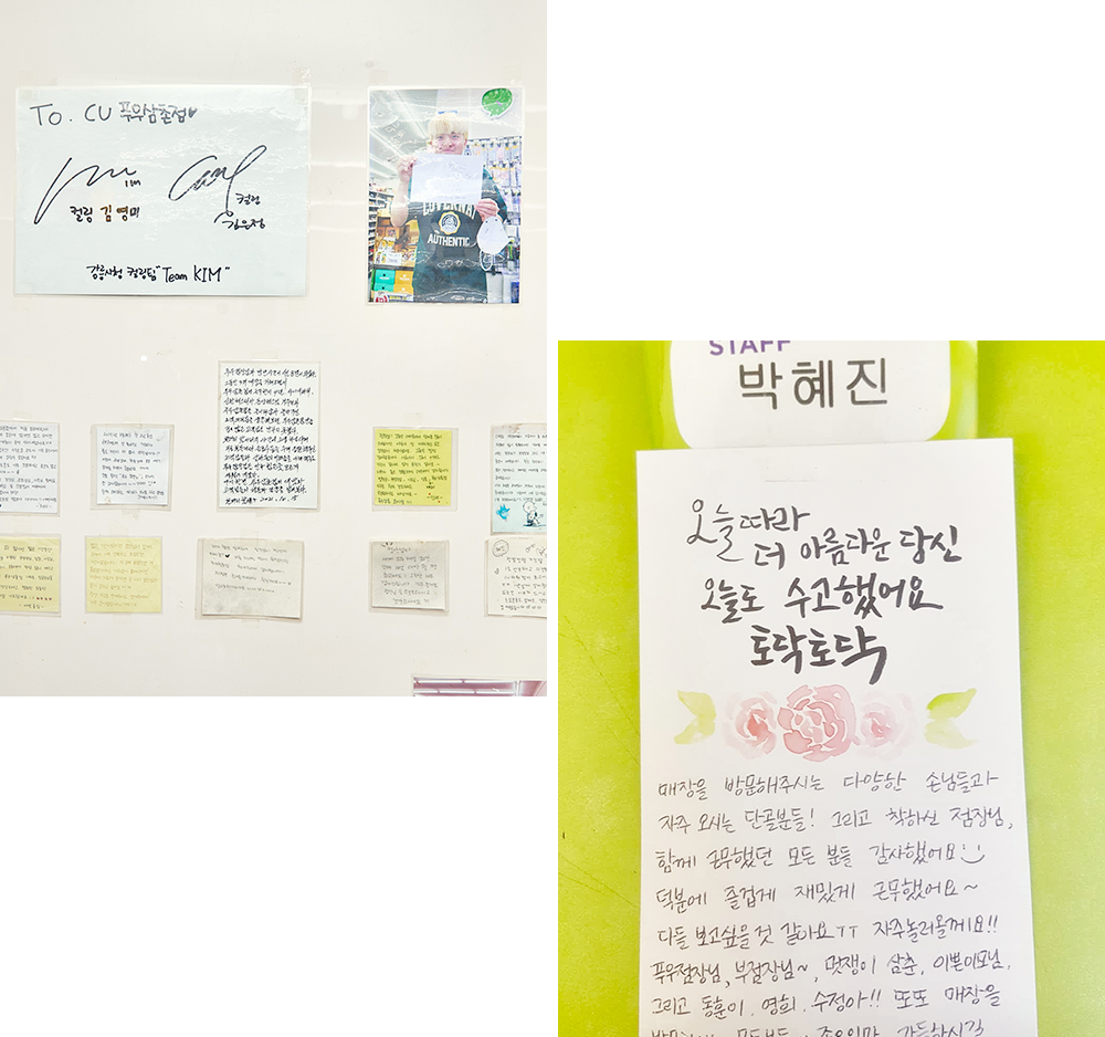 업장이잖아요. 그런데 저희 CU 스태프들은 대부분 4년 이상 근무하실 만큼 만족도가 높고 오래 함께하는 경우가 많습니다. (웃음) 가끔 퇴사하신 후 찾아 주셔서 손 글씨 메모를 기록해 주시기도 하는데, 그럴