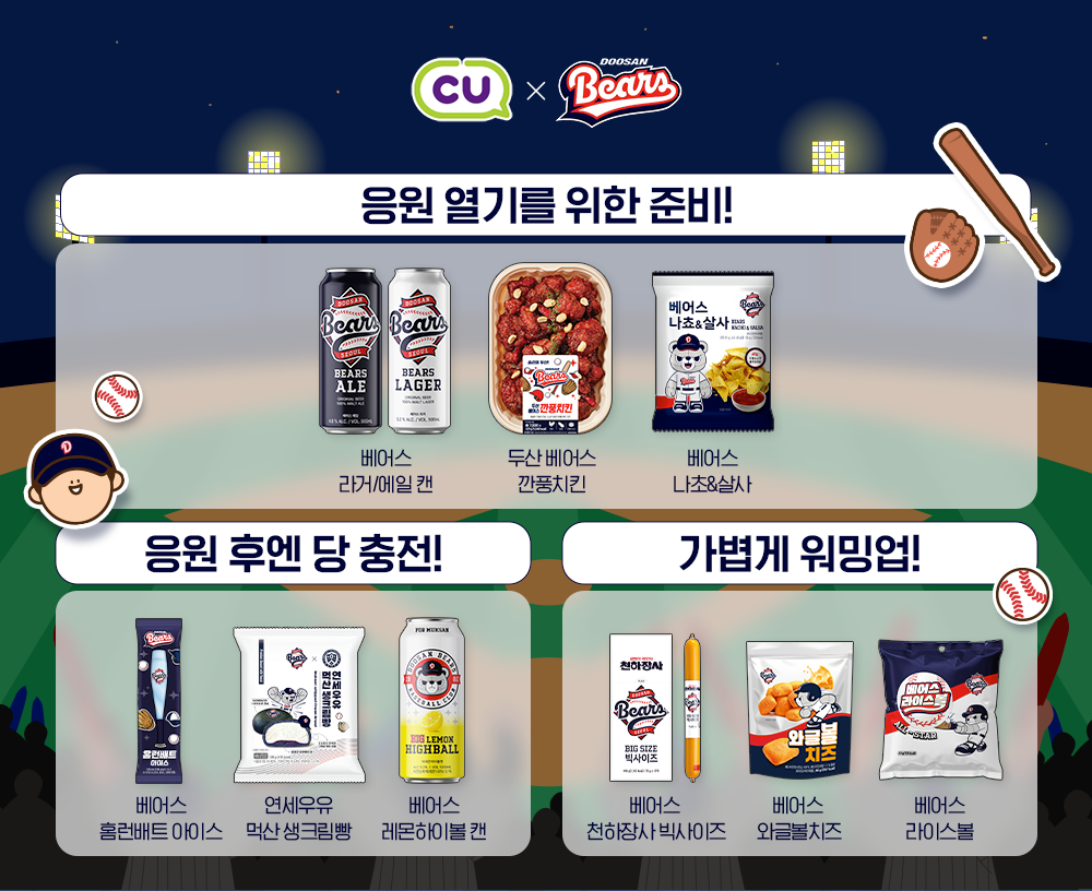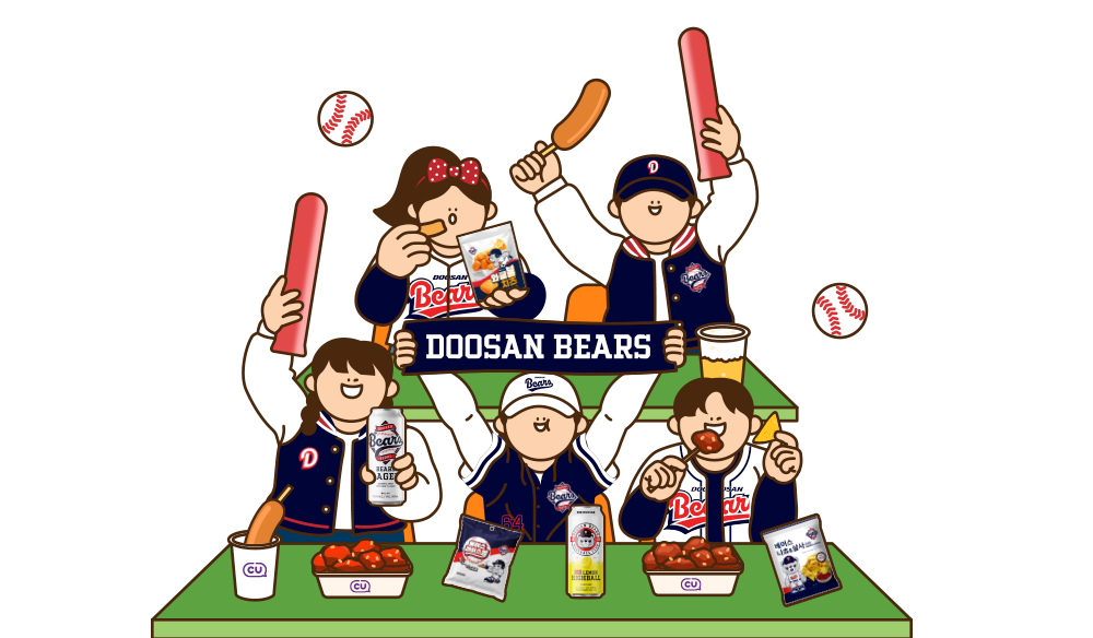 봄부터 가을까지 우리를 울고 웃게 만드는 국민 스포츠, 프로야구. 치열한 승부의 긴장감, 뜨거운 응원의 열기, 그리고 소중한 사람들과 함께하는 순간은 그 자체로 일상의 특별한 탈출이 됩니다. 이 특별한 순간에 빠질 수 없는 것이 바로 간식이죠! 그래서 준비했습니다. CU와 두산 베어스가 함께 준비한 감각적인 콜라보레이션! 지금 그 특별한 만남을 소개합니다.