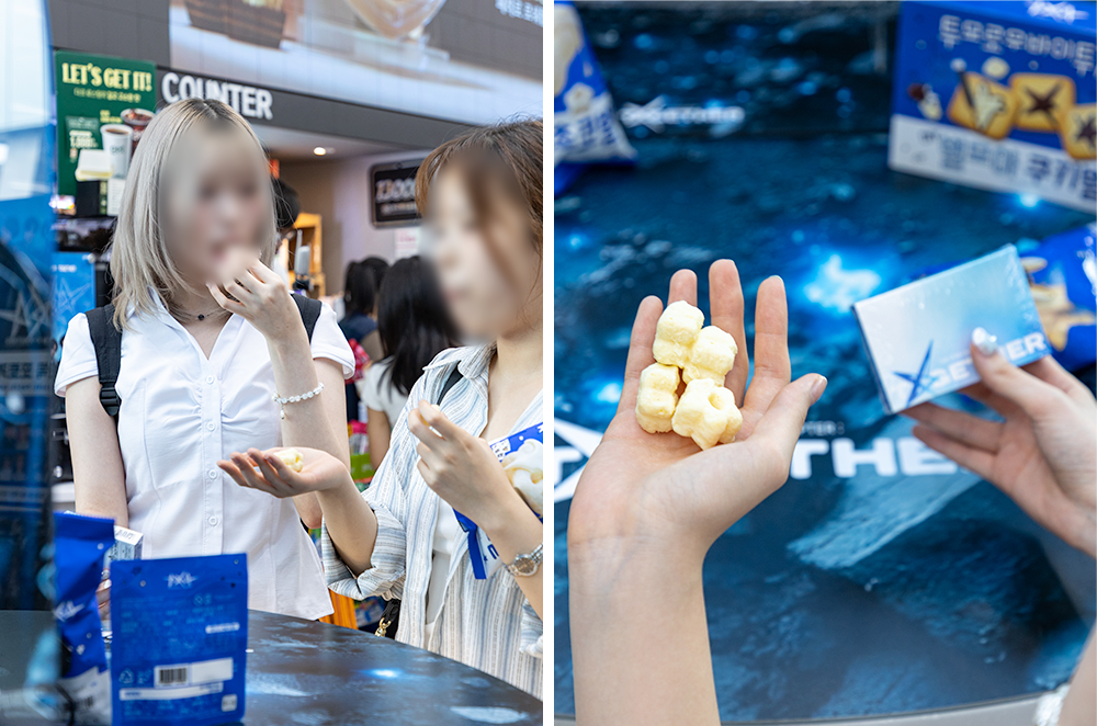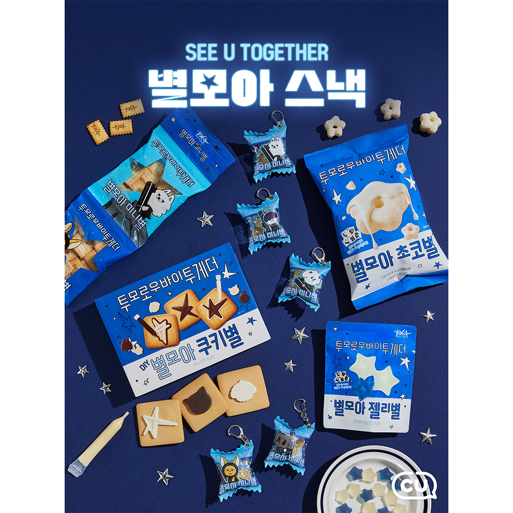 TXT의 시그니처 모티브인 ‘별’을 그대로 담아낸 ‘별모아’ 스낵은 이번 협업의 상징이에요. 팬덤명인 ‘MOA(모아)’와 별을 결합한 작명부터, 제품 안에 실제 별 모양 젤리·비스킷·쿠키로 구현된 구성까지, 팬이라면 놓칠 수 없는 디테일이 가득하죠. 특히 초코펜으로 직접 꾸밀 수 있는 DIY 쿠키로 또 하나의 즐길 거리를 마련했습니다.