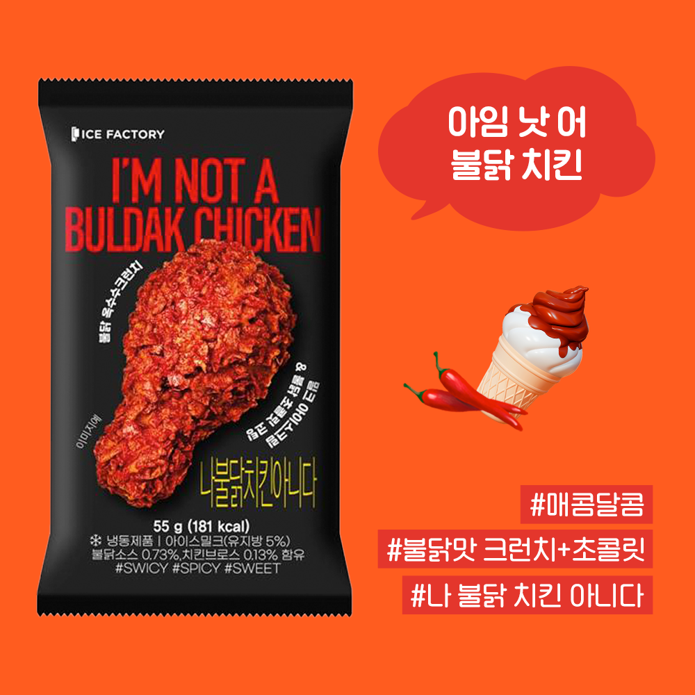흐름을 보며, 이미 전 세계적으로 잘 알려진 ‘불닭맛’을 아이스크림과 결합한다면 어떨까 하는 발상이 떠올랐어요. (웃음) 그렇게 탄생한 불닭맛 치킨 아이스크림 ‘아임 낫 어 불닭 치킨’은 한국에서만 맛볼 수 있는 특별한 조합이자, 앞으로 역수출까지 기대되는