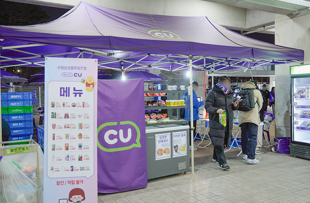 영하 8도의 매서운 추위에도 수원월드컵경기장은 사람들로 북적였습니다. 손마다 쥐어진 파란 깃발과 응원 굿즈가 하나둘 모여 입장 게이트는 어느새 파란 물결로 가득해졌고, 그 사이 보랏빛 CU가 든든하게 자리하고 있었죠. 그리고 바로 그곳에서, 그날의 뜨거움을 누구보다 가까이에서 지켜낸 송결 주임을 만났습니다.