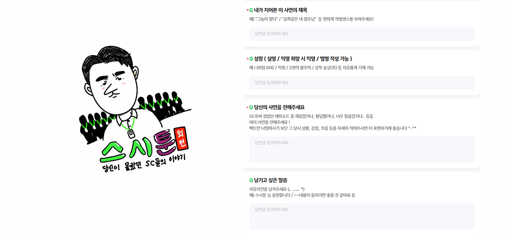 그때부터 ‘스시툰-외전’을 만들고, 익명 게시판의 특성을 살려 네이버 폼으로 사연을 받기 시작했습니다. 대단한