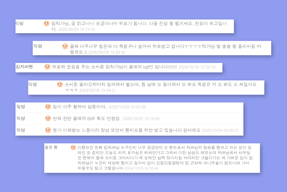 되었다’, ‘커피 사주고 싶다’ 등등… 많은 댓글을 달아주시는 게 매번 기억에 남아요. 특히 스스로 ‘숨은 팬’이라고 소개하며 제 정체를 상상하는 댓글을 남겨주신 분의