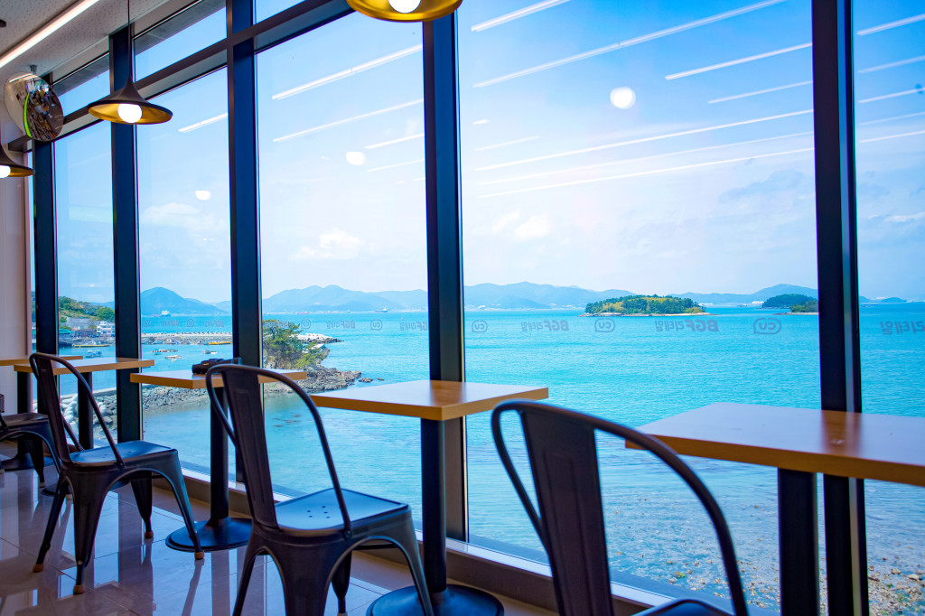 마주보고 자리했습니다. 점포 한 면을 가득 채우는 푸르른 남해의 전경은 자연 그대로의 풍경화나 다름없죠.