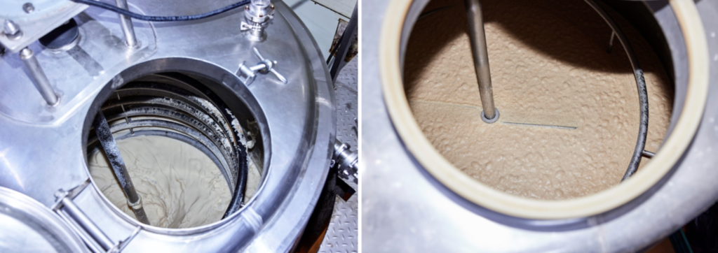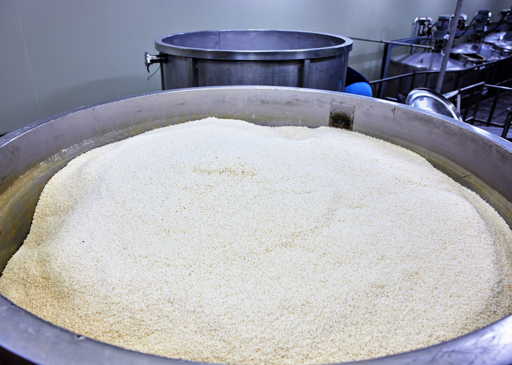 첫 여정은 쌀 세척부터 쌀 세척실에서는 쌀을 여러 차례 깨끗하게 씻은 후 분쇄기로 보냅니다. 전통 방식대로라면 주로 고두밥을 지어 원액을 빚지만, 우포의아침에서는 쌀을 가루내 누룩과 함께 반죽하는 방식을 따릅니다. 안정적이면서도
