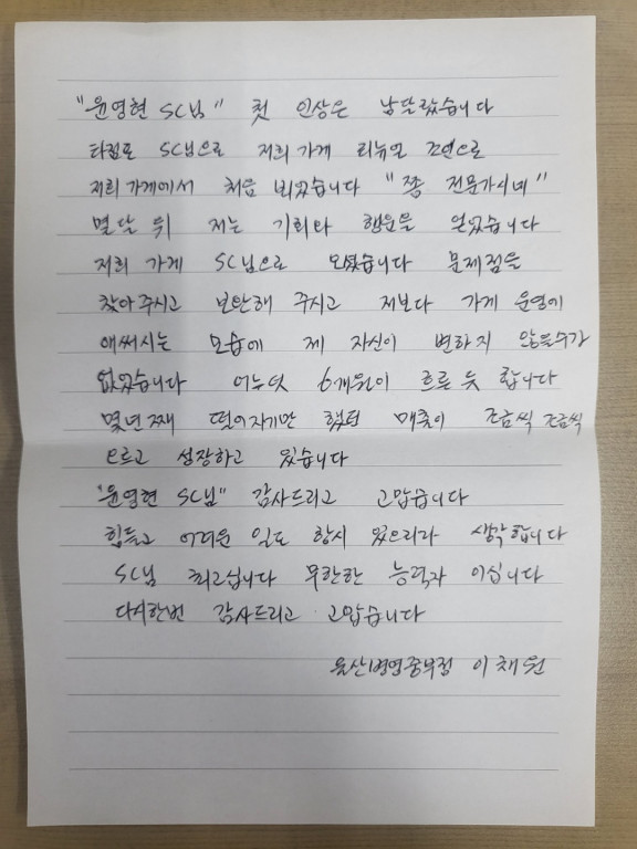 점주 어머, 그렇게 말씀해주시니 제가 더 고맙지요. SC님께 이 고마움을 어떻게 표현해야 하나 생각하다 홍보팀에 손편지를 다 썼지 모예요. 온 회사에 ‘소문’ 좀 내달라고요. 편지에도 백 번 썼지만 그래도 또 말씀드리고 싶네요. 윤영현 SC님, 정말 감사해요!