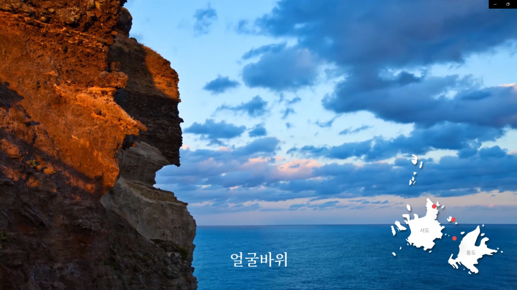 제가 촬영한 독도 이미지를 시네마 형식으로 편집해 짧은 다큐멘터리처럼 만들었어요. 자막도 들어가고 음향도 입혀 한 편의 영화처럼 완성도가 느껴집니다. 간단한 설명과 더불어 영상에 포개지는 지도 그래픽 등이 독도에 대한 이해와 감동을 이끌어줄 거예요.