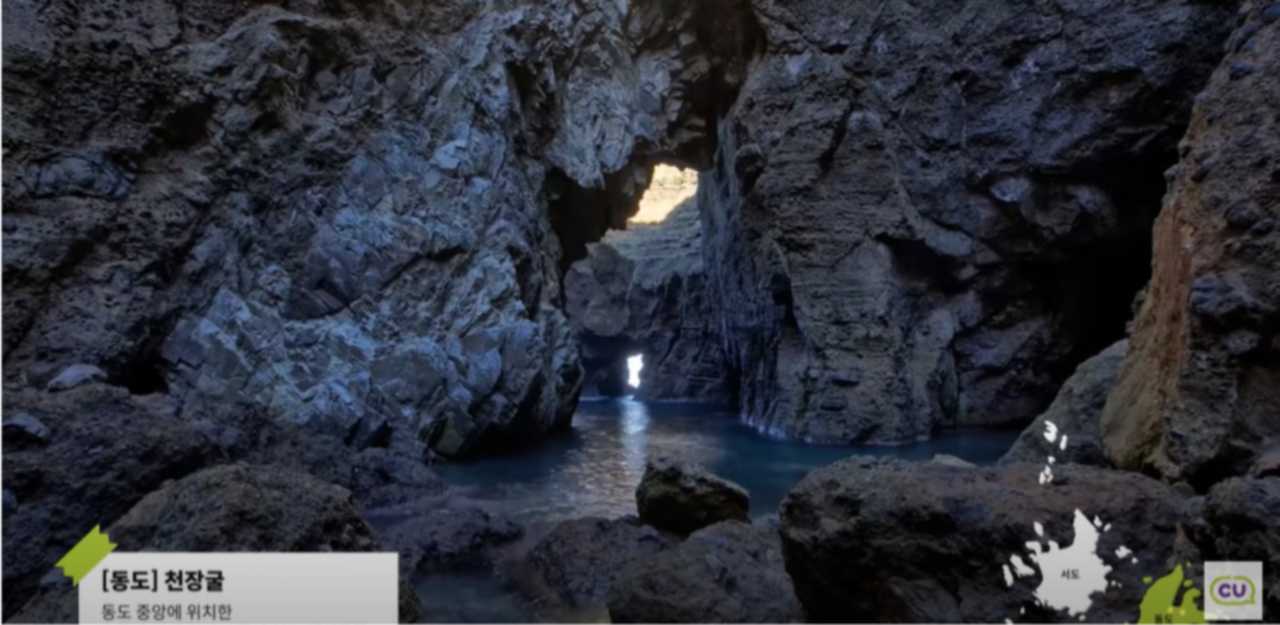 동도에 올라서면 한가운데에 움푹 꺼진 거대한 동굴이 보이는데, 여기가 천장굴입니다. 거의 수직 절벽이기 때문에 위에서 내려다보면 아찔하기 그지없고, 바닥에는 바다 쪽으로 뚫린 동굴을 통해 바닷물이 들어와 있는 것이 보이죠. 거기로 작은 고무보트를 타고 좁은 동굴로 들어가면 갑자기 사방이 컴컴해지는데 저 끝 위에서 빛이 쏟아지는 것이 보입니다. 수직 위로 뻥 뚫린 천장굴 바닥에 가까워지면서 주위가 점점 밝아지고, 갑자기 넓어지는 공간에 도착해요. 천장굴에 들어가면서 느끼는 자연의 경이로움은 말로 다 표현하기 어렵죠.