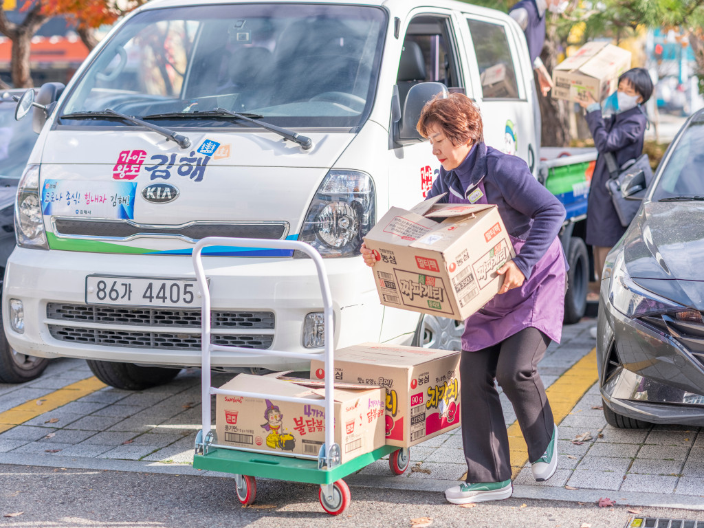 김해 장유1동 행정복지센터에 도착! 운반 카트에 선물 상자를 옮겨 담아 행정복지센터에 전달했습니다. 오늘 기부한 도시락은 꿈샘지역아동센터, 세바퀴지역아동센터, 징검다리다문화아동센터로 각각 전달될 예정인데요. 혹시라도 아이들이 부담스러워 할까봐 직접 방문하지 않고 행정복지센터를 통한 전달 방식을 택한 겁니다. 아이들을 배려하는 마음에서죠.