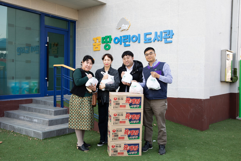 소식을 듣고 기다리고 있던 꿈땀어린이도서관 관장님과 자원봉사자분들이 한걸음에 달려 나와 선물 전달을 도왔습니다.