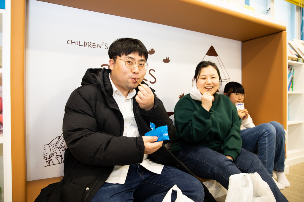 도서관에 있던 사람들이 꾸러미에서 간식을 하나씩 꺼내 먹을 때마다 도서관 안으로 달콤한 향이 퍼져 나갑니다. 그 달달함만큼, 모여 앉은 사람들의 입가에도 웃음꽃이 활짝 피어났습니다.