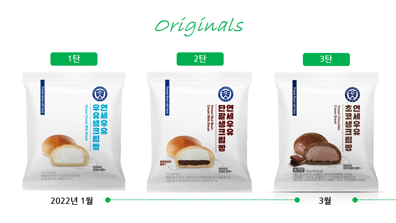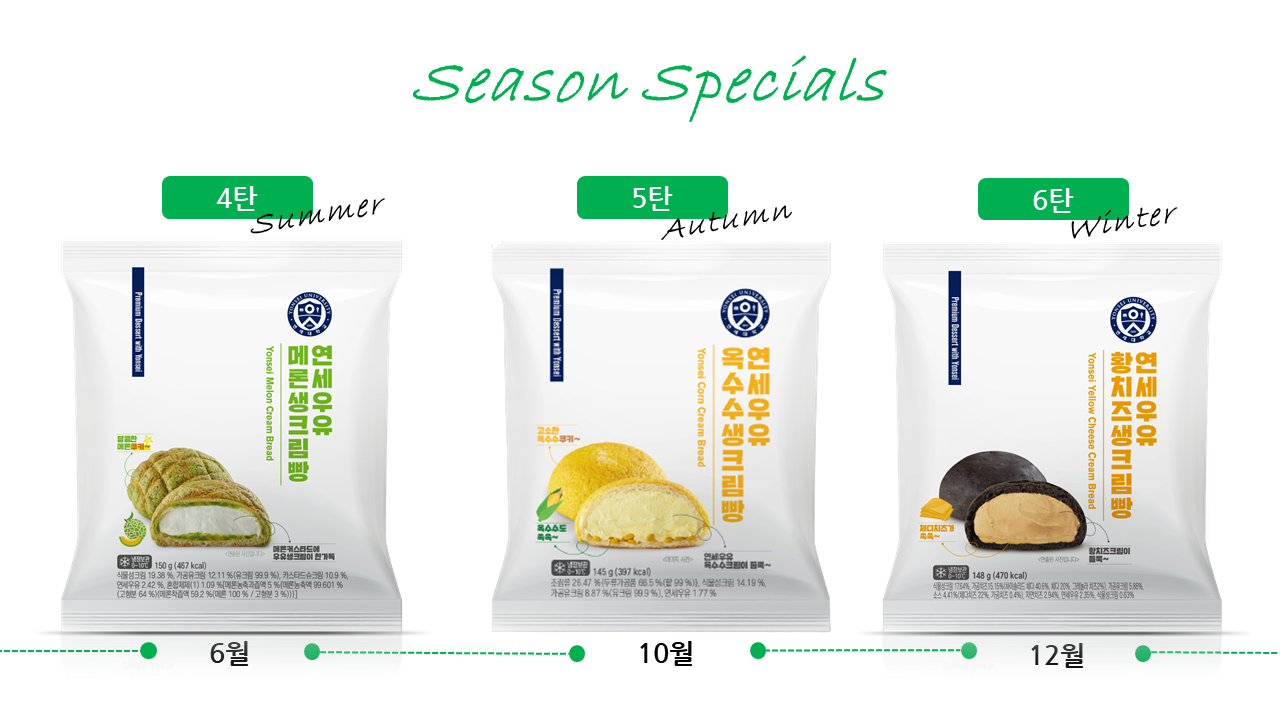 1탄 우유생크림빵 연세우유 생크림빵의 정체성이라 할 수 있는 달지 않고 산뜻한 우유 풍미와 생크림의 쫀득한 식감 ● 2탄 단팥생크림빵 쫀득한 우유크림 사이로 몽글몽글 씹히는 단팥 알갱이가 맛에 포인트를 주는 단팥생크림빵 ● 3탄 초코생크림빵 우유크림에 이탈리아산 초콜릿을 듬뿍 섞어 고급 쇼콜라티에처럼 깊고 진한 초코크림을 완벽 재현